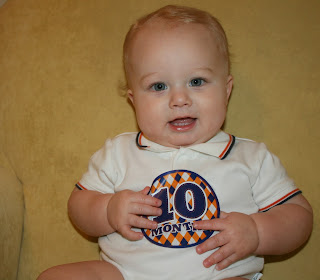 You LOVE looking out the window in your bedroom and watching the cars, birds, and dogs go by. Overall you are an easy going little guy! I had to take you to the doctor for your first sick visit this month. You had a viral cold for a few days. Your stats at 9 months were: 27.25 inches tall and you weighed 21 lbs and 7 oz. You were in the 60th% for weight and only the 12th% for height. When you put the ratio together, it makes you 96% for your size. You are kind of like a little cube! Maybe we can work on stretching those legs! You really are so sweet and chubbalicious!